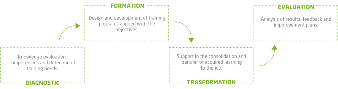 We accompany our clients in the transformation process of their organization towards new methodologies, processes or technological and management tools. All this, with customized contents and adapted to the company’s environment.